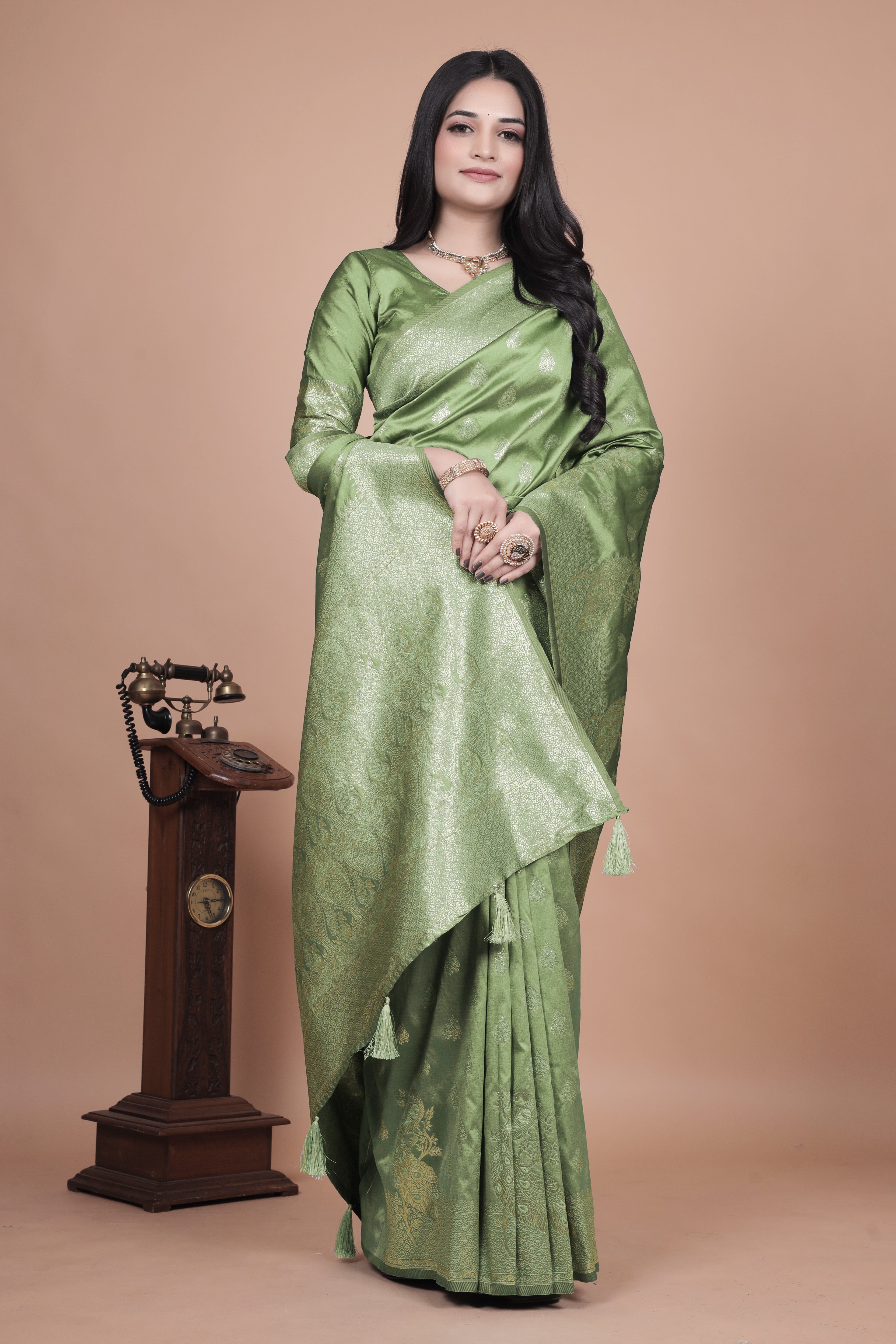 Banarasi Silk Saree with Zari Weaving - Mint Green with Golden Accents