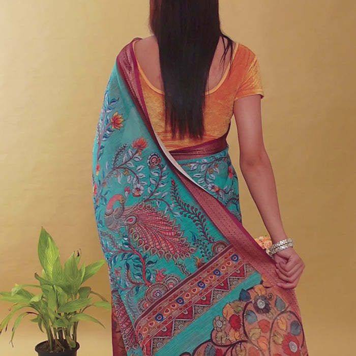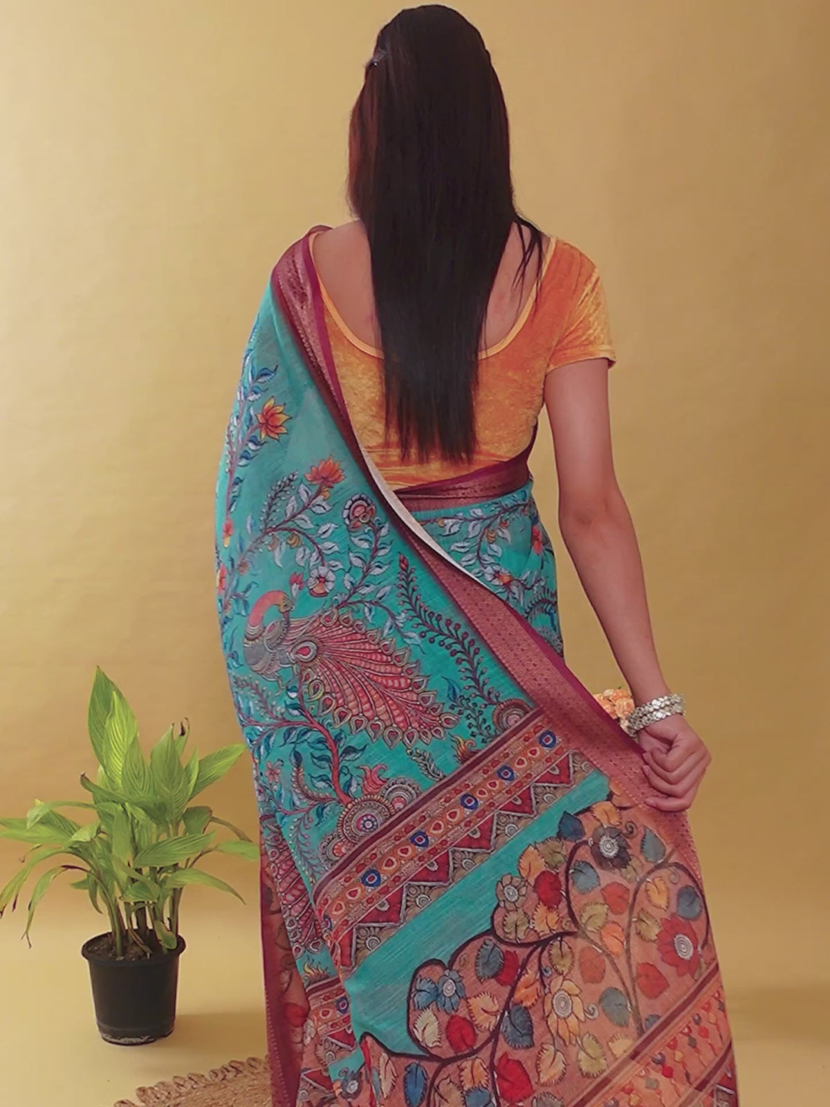 🔹 Color: Aqua Teal Base with Multi-Colour Peacock & Floral Print, Deep Maroon Border