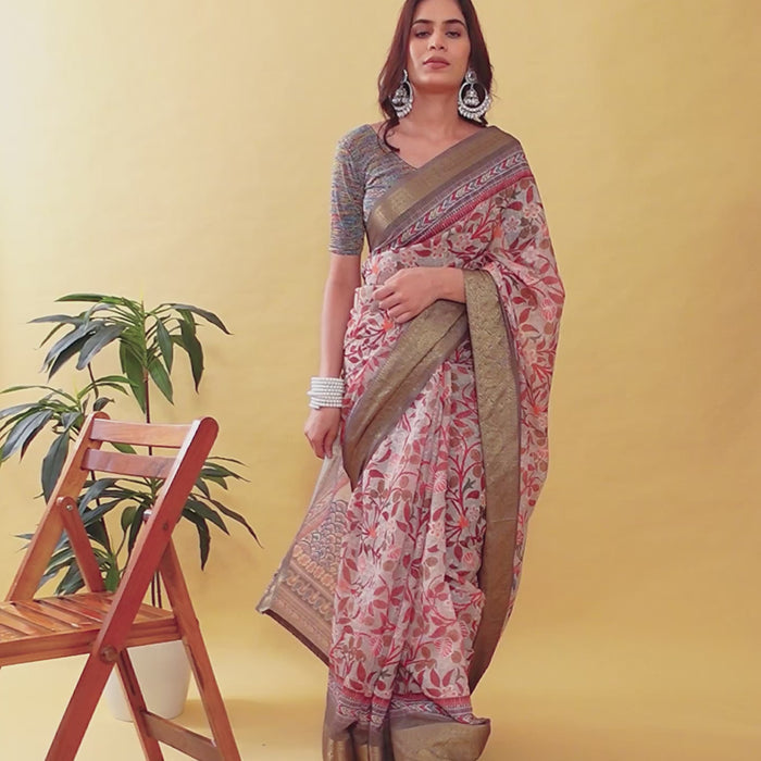The saree’s light beige base is adorned with intricate Kalamkari-inspired digital prints — featuring delicate florals, foliage, and an exquisite elephant motif on the pallu, symbolizing heritage and prosperity. 🐘