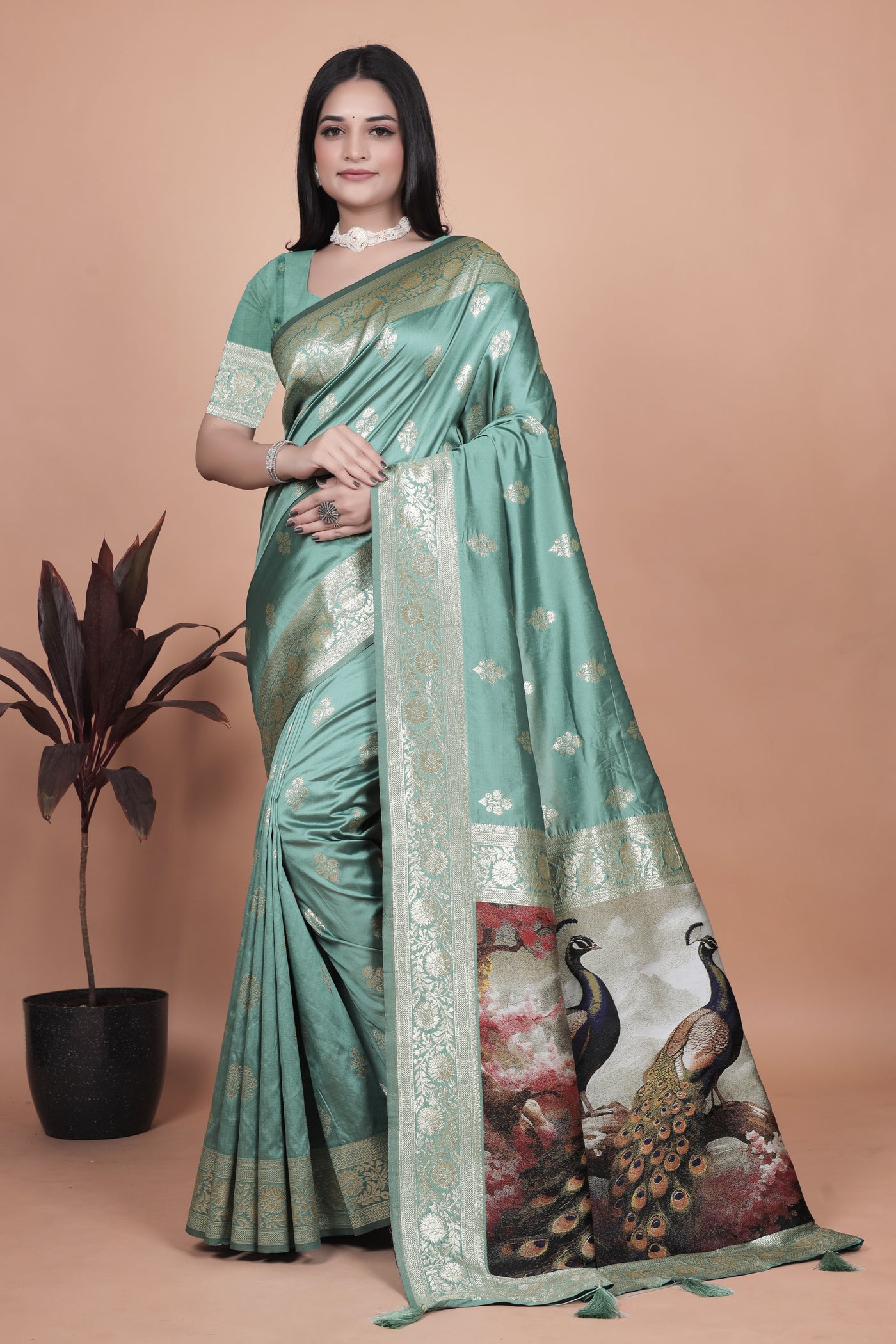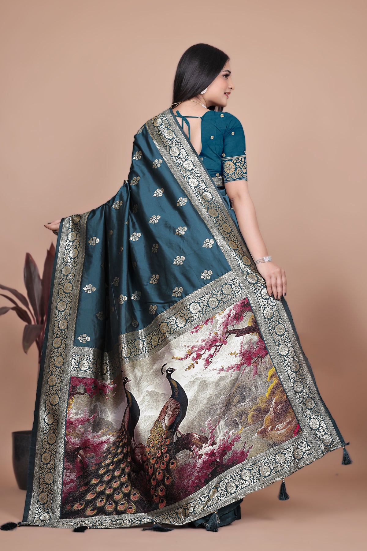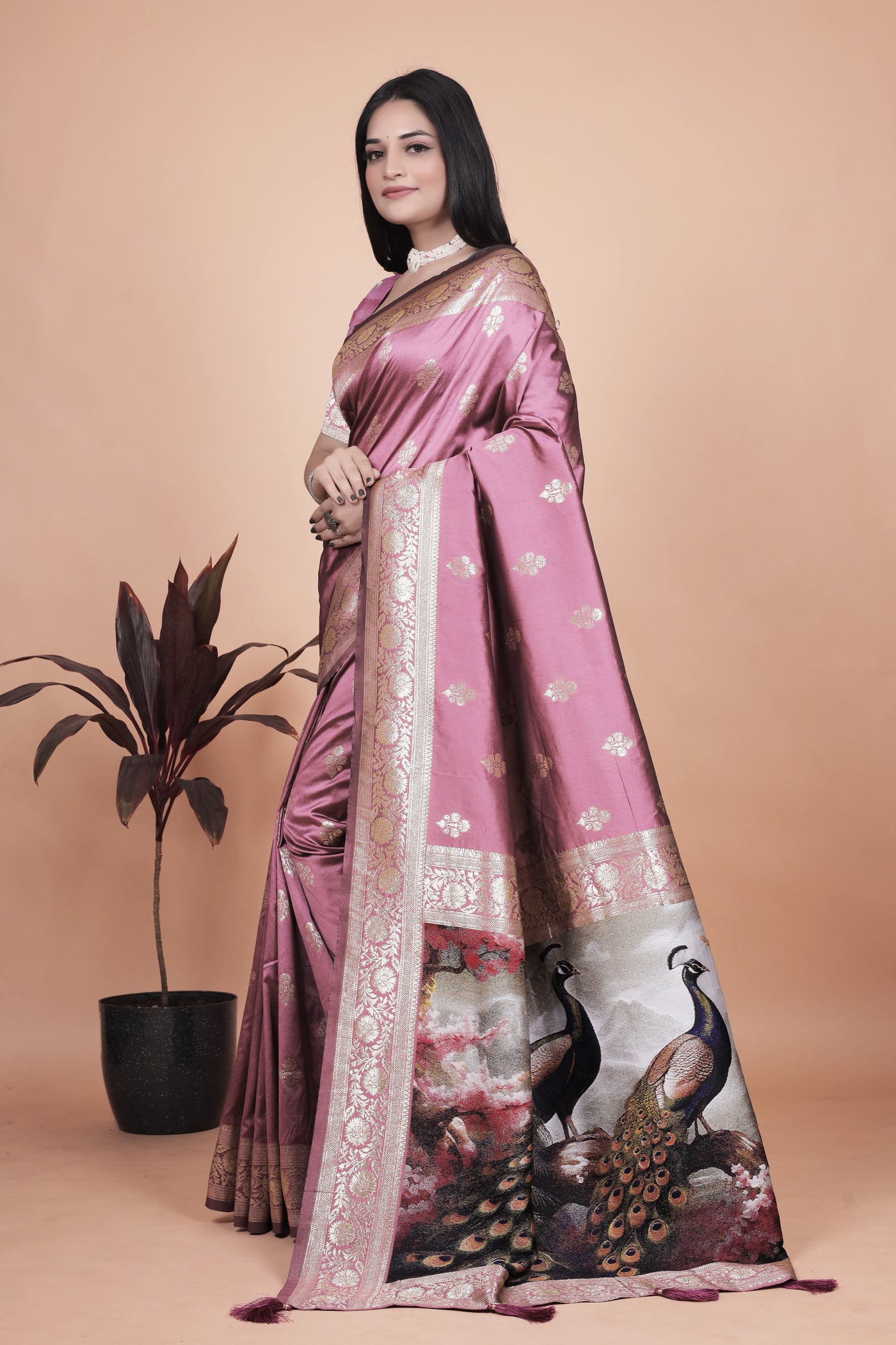 Royal Purple Banarasi Silk Saree with Peacock Pallu Design - Lavender with Emerald Green Border & Pallu