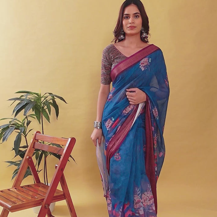 Teal Blue Floral Digital Print Saree with Rich Maroon Zari Border | Premium Linen Cotton Saree