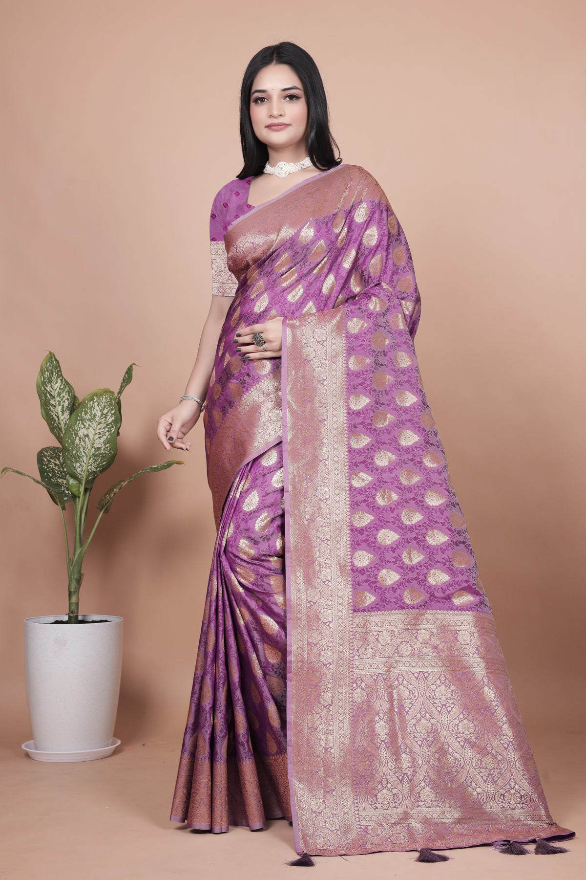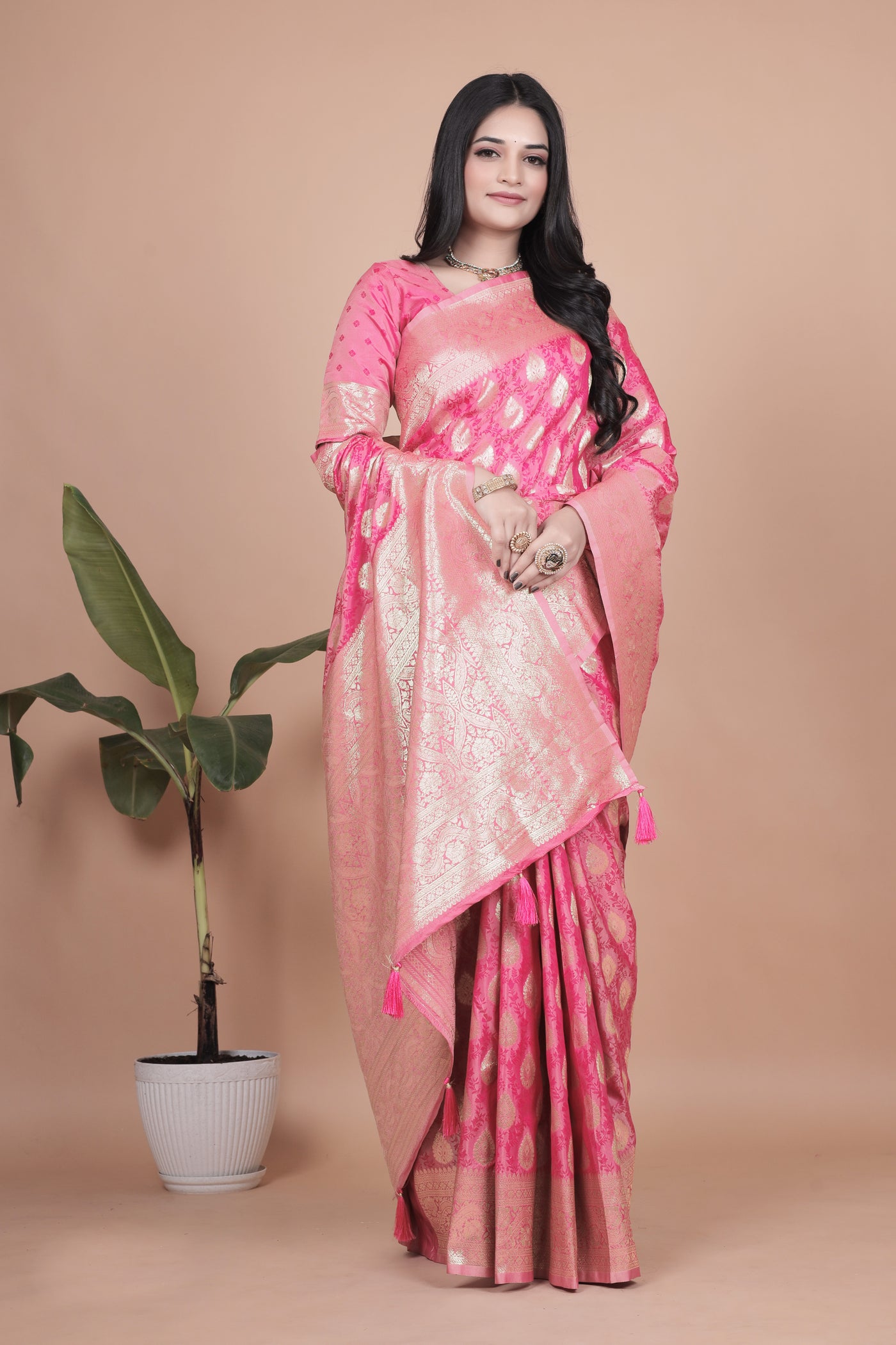 Banarasi Silk Saree with Golden Zari Weaving with 4 color option - Rani Pink with Golden Zari
