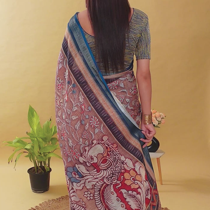 Heritage Brown & Teal Artistic Linen Cotton Saree | Kalamkari/Pichwai Style with Jacquard Border