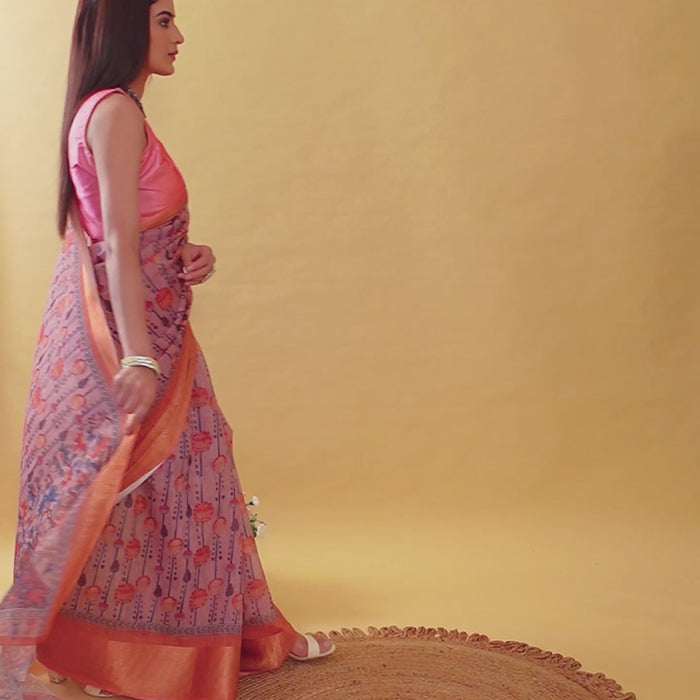 Mauve Floral Linen Cotton Saree | Elegant Jacquard Copper-Orange Border