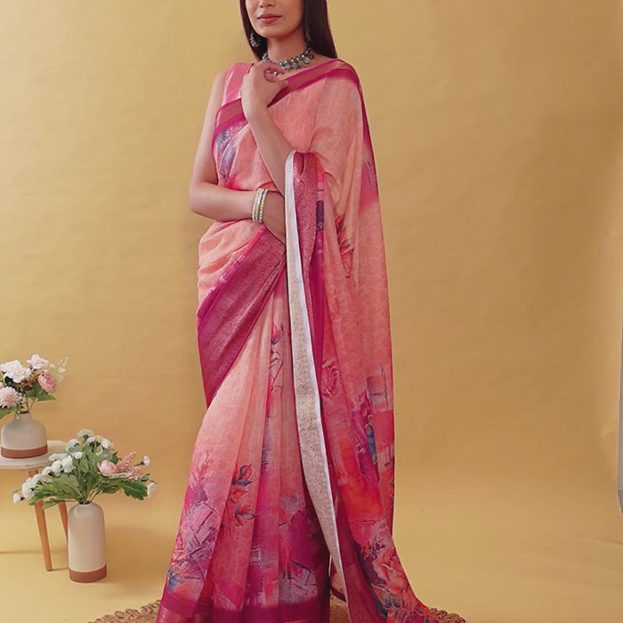 The rich dark maroon jacquard border adds depth and sophistication, perfectly balancing the modern print with traditional charm. Its lightweight and comfortable fabric makes it ideal for festive celebrations, cocktail parties, and special occasions, ensuring you stand out in style.