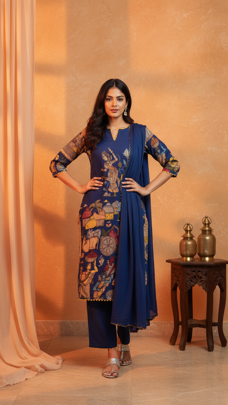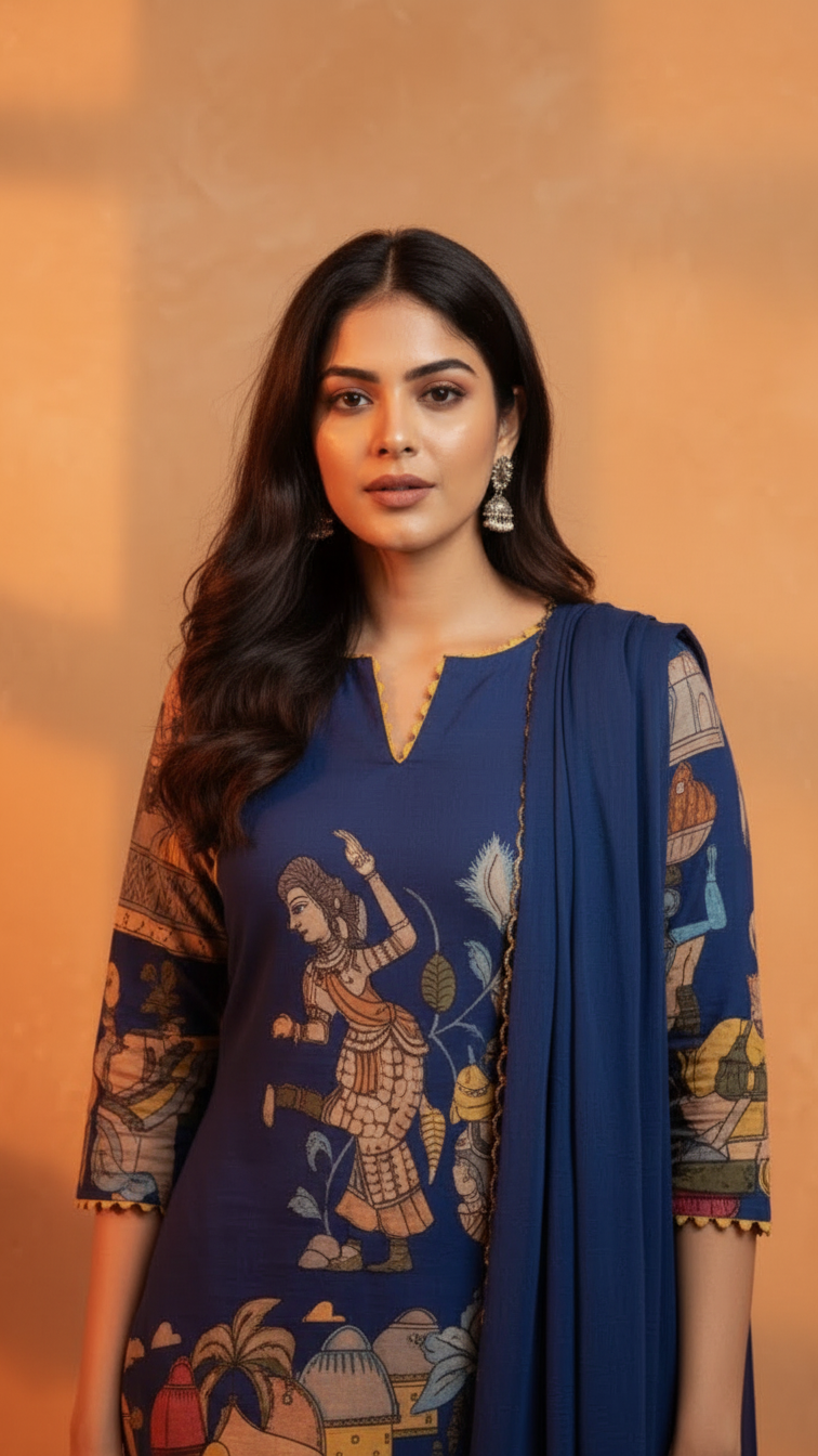 Traditional Kalamkari Print Cotton Kurti Set - S